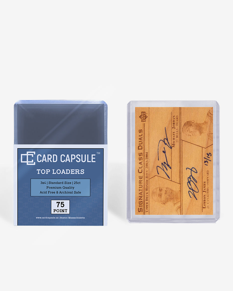 Designed to hold cards up to 75 point, CARD CAPSULE 75 pt toploader hard cases are acid-free and archival safe. Made of the highest quality crystal clear plastic, these card holders provide great protection for trading cards.